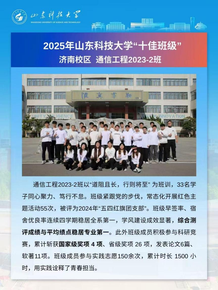 近日,山东科技大学电气信息系通信工程2023级2班荣获2025年“十佳班级”称号。该班33名学子怀揣梦想、携手共进,以“道阻且长,行则将至”为信念,在思想、学业、科创、服务等方面表现突出,书写了新时代青年的青春答卷。